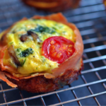 - Any remainder oil from pan can be brushed into muffin tins before you place ½ or a full slice (up to you)of prosciutto to form the muffin ‘wrapper’
